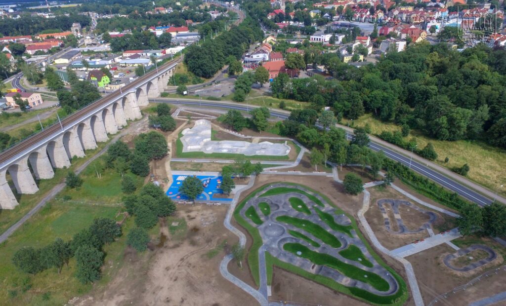 Na obiekcie znajduje się skatepark oraz tor pumptrack z dużą ilością terenów zielonych. W tle znajduje się również zabytkowy wiadukt wybudowany w 1846 roku. Ma on około 500 m długości, co czyni go jednym z najdłuższych tego typu obiektów w Europie.